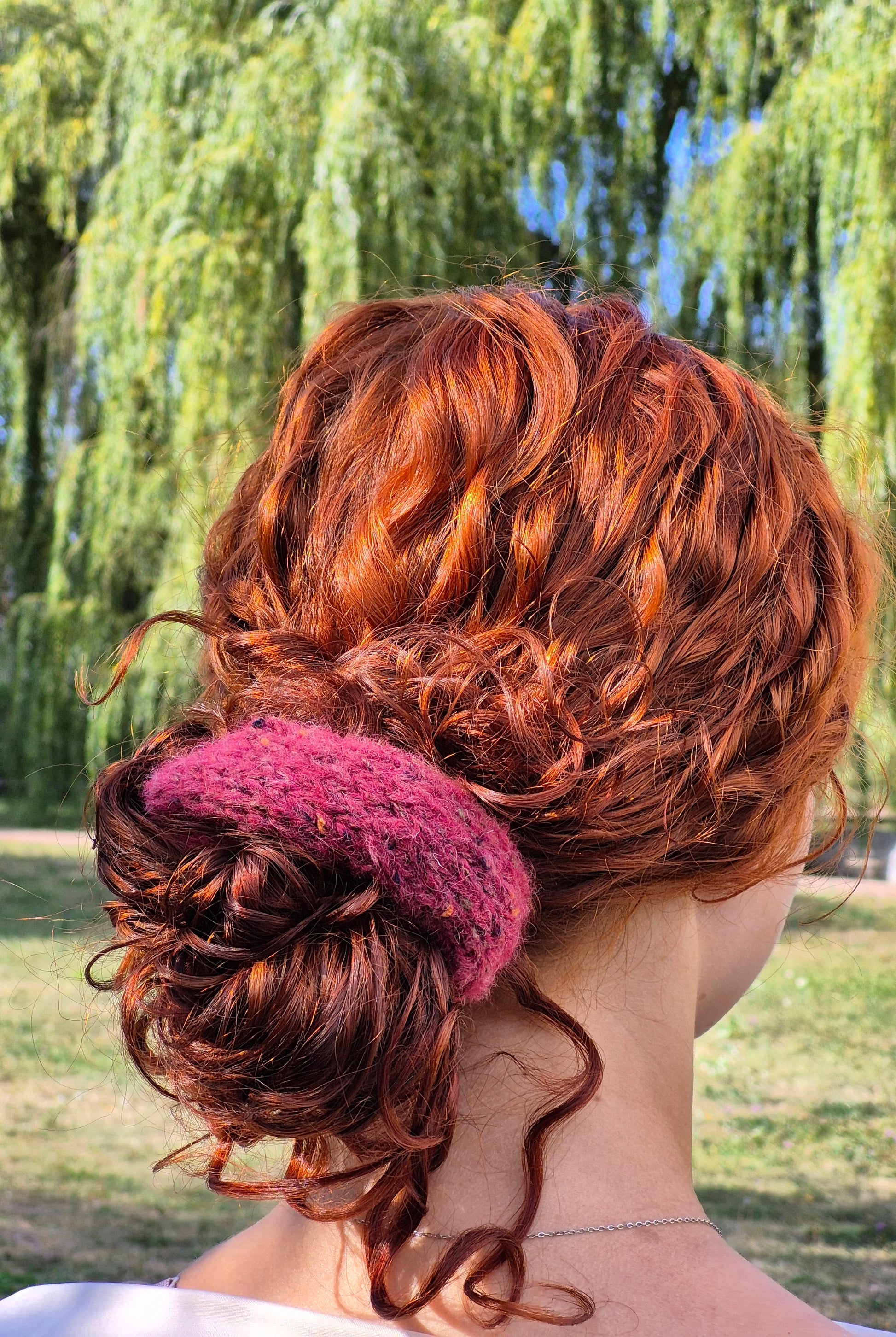 This hand-knit scrunchie is crafted from luxurious mohair, known for its cloud-like softness and delicate texture. Light and airy, it adds soft volume to ponytails and buns while remaining gentle and comfortable to wear.
